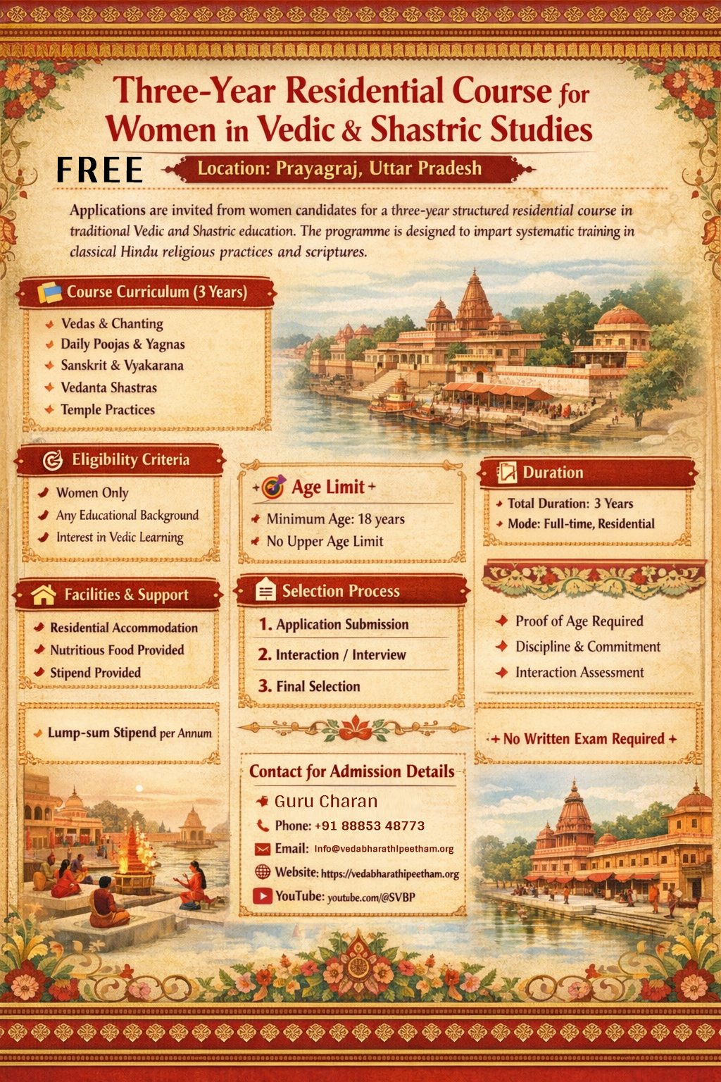 Applications are invited from women candidates for a three-year structured residential course in traditional Vedic and Shastric education. The programme is designed to impart systematic training in classical Hindu religious practices and scriptures.